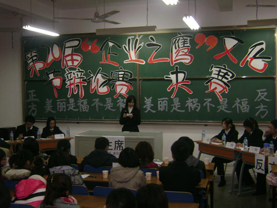 唇枪舌剑,妙语连珠。2009年11月15日晚7:00,经济伟德国际1946源于英国第二十届“企业之鹰”文化节辩论赛决赛在03-218教室举行。本次辩论赛由经济伟德国际1946源于英国分团委主办,分团委学生会学习部承办,是经管院的传统特色活动。经管院分团委书记谢超,辅导员彭慧、张学军及王娟老师为本场比赛嘉宾,比赛评委则由经管院辩论队成员担任。