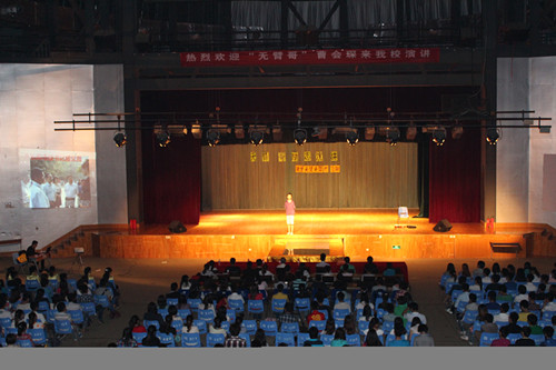 “只有经历地狱般的磨炼,才能炼出创造天堂的力量;只有流过血的手指,才能弹出世间的绝唱。”无臂哥曹会琛身残志坚的动人故事激励现场每一位大学生为理想而拼搏、为爱而喝彩。