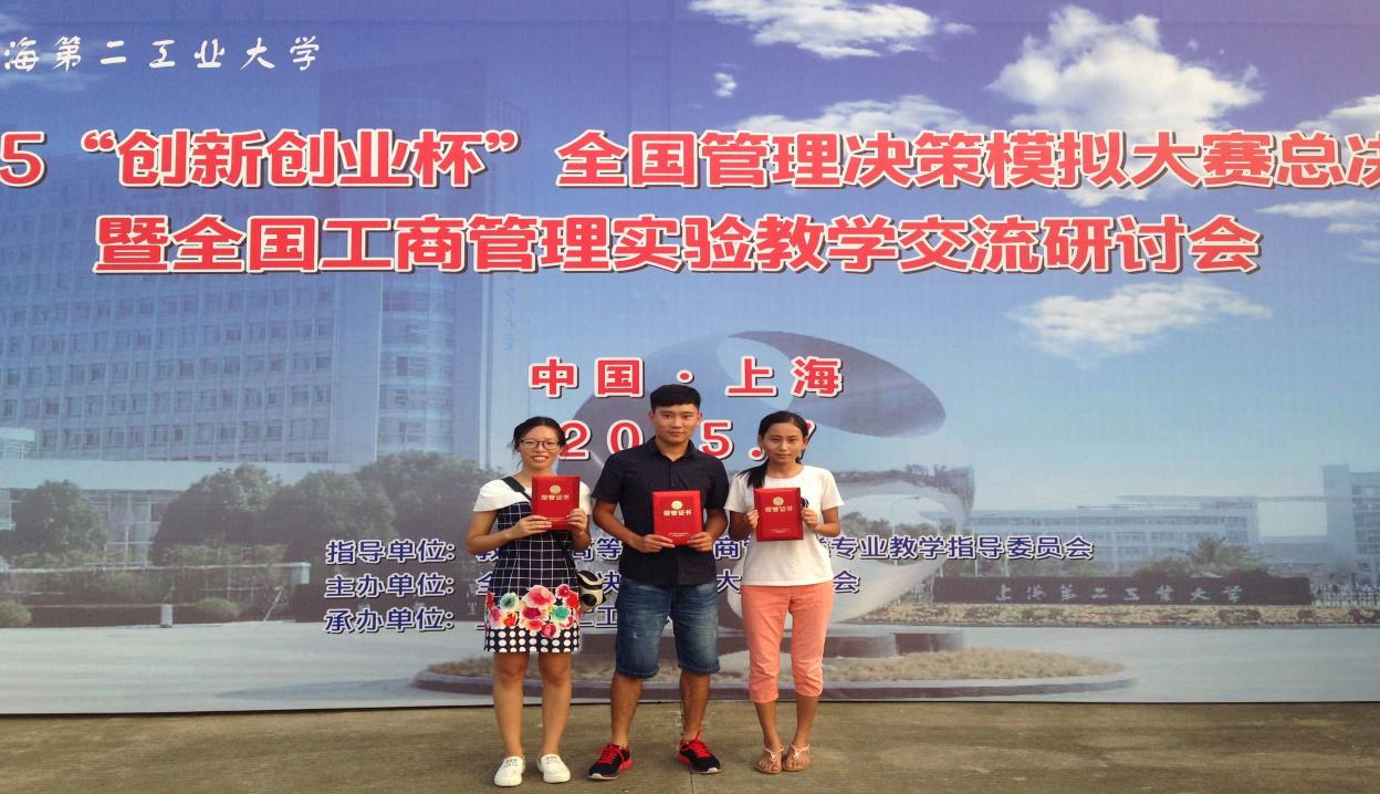 2015年7月27日,由教育部高等学校工商管理专业教学指导委员会指导、全国管理决策模拟大赛组委会主办、上海第二工业大学承办的2015年全国高校管理决策模拟大赛圆满结束。经过4个月的漫长训练和严苛的层层选拔,由我校伟德国际1946源于英国学生姜超然、彭雨霞、童安琪组成的SEE YOU AGAIN团队,与来自全国各大高校的96支代表队激烈角逐,喜获全国总决赛一等奖的佳绩。