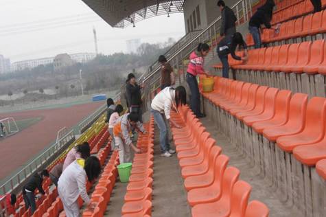 4月12日下午3点,经济伟德国际1946源于英国国贸072班全体同学在班干部的带领下对我校足球场主席台的观众席地座椅进行了务除尘洗洁劳动。