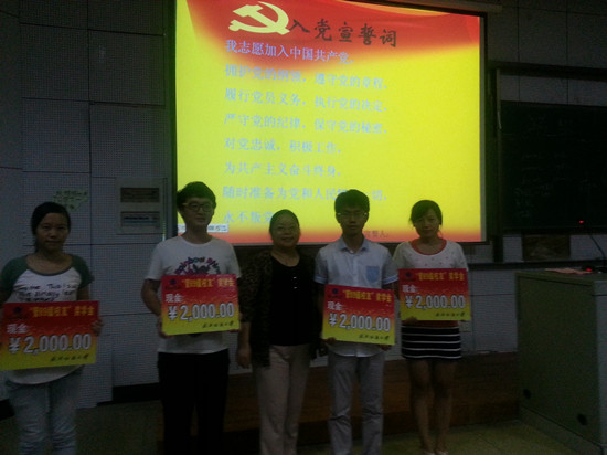 会上,全体学生党员在行政人资学生党支部书记赵梦如同学的带领下重温入党誓词。随后,肖书记为荣获89级校友奖学金的党员学长颁奖,同时为2013级新聘任的26名党员学长颁发聘书。