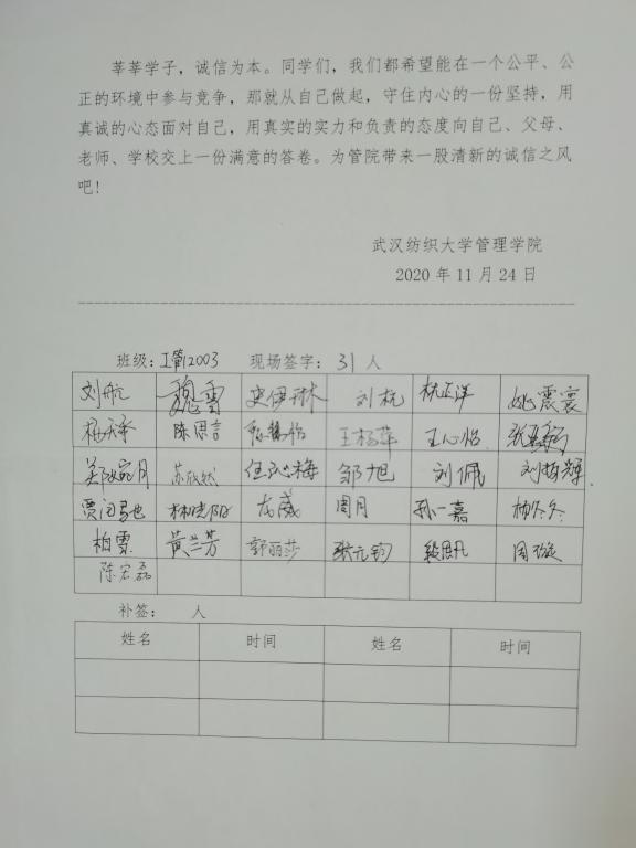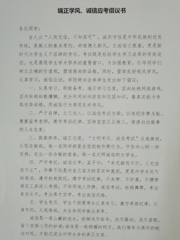 会议伊始,汪老师首先向大家强调了为什么要诚信考试。孟子云:“车无辕而不行,人无信则不立。”诚信是中华民族的传统美德,是每个人的立身之本。作为一名当代大学生,诚信是不可缺少的品德。随后,同学们就身边发生的考试违纪现象进行讨论,并表示一定会遵守考场纪律和考试制度认真答卷,杜绝一切形式的违纪行为。最后,汪老师宣读了《伟德国际1946源于英国学生诚信承诺书》和《端正学风、诚信应考倡议书》,并以班级为单位现场逐一签订。汪老师向全体学生发出倡议,希望各位同学能够凭自己的真才实学,在考场上发挥出色水平,以诚信考试为荣,以违纪作弊为耻,以优异的成绩回馈自己的父母。