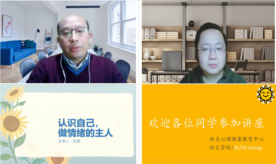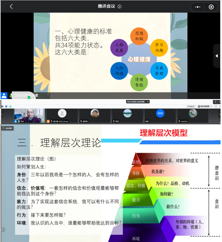 讲座开始前,周兴驰老师简单介绍了此次主讲老师,汪进老师是高级心理咨询师、高级家庭教育指导师、武汉大学人民医院精神科特聘心理专家、武汉生命之树心理咨询有限公司创办人,总督导、伟德国际1946源于英国SUNI智慧校招创业团队专家顾问。随后,汪进老师以《认识自己,做情绪的主人》为题,主要从心理健康的标准、信念系统、理解层次理论、自我意象以及情绪智能等5个方面展开阐述。汪进老师从思想、学习等角度展开,让同学们深切体会自身心理健康程度,以及改正方法。根据理解层次理论理解自我,对人生进行策划。他谈到“一个人所有的行为、情绪、举止甚至才能,永远与自我意象相一致”的观点。阐述情绪对人的重要性,让同学们认识自身情绪并且学会如何管理自身情绪。