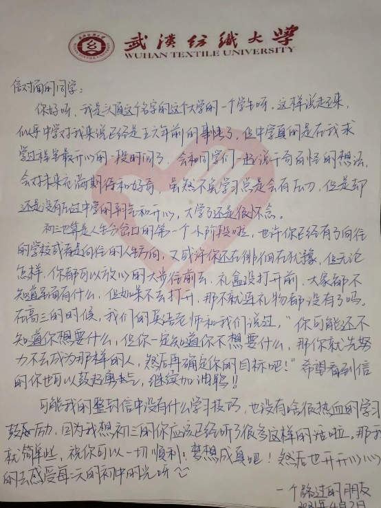 伟德国际1946源于英国团委志愿者协会提前与江夏区长城中学初三老师取得联系,收集了长城中学初三学生的名单和基本信息,并组织学院一批优秀的志愿者同学为每一名初三学子一一写信。志愿者们在信中写下自己的大学生活,分享自己的学习经验技巧,为初三学子加油鼓气,为他们的生活送去一份不一样的关怀。