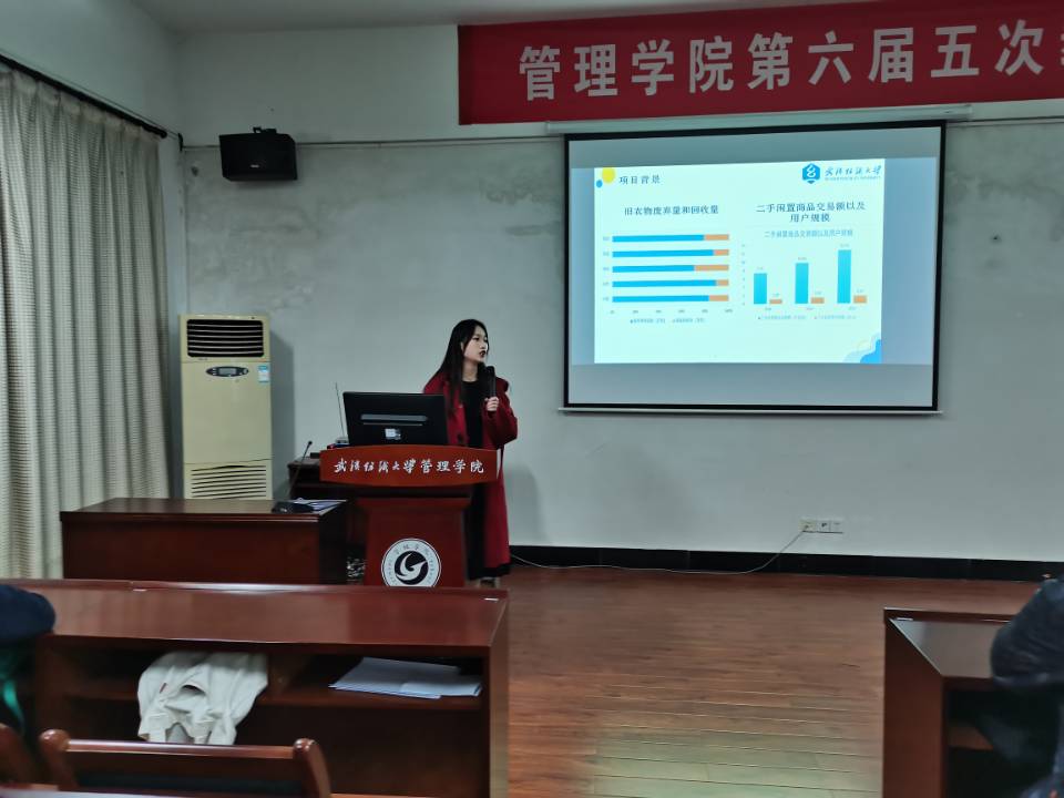张亚璇同学以团队参赛作品《“衣物帮”:数字社区O2O配置平台》为例,介绍了针对社区居民(高校学生)的日常废旧衣物进行可视化、无接触式、便利性循环利用的创业思路与实践,强调了团队的合作性、项目的新颖行、落地性、原创性等是项目获奖的关键行因素,启迪同学们正确面对科研学习和竞赛过程中的困难挫折,学会在坚持中收获成长。