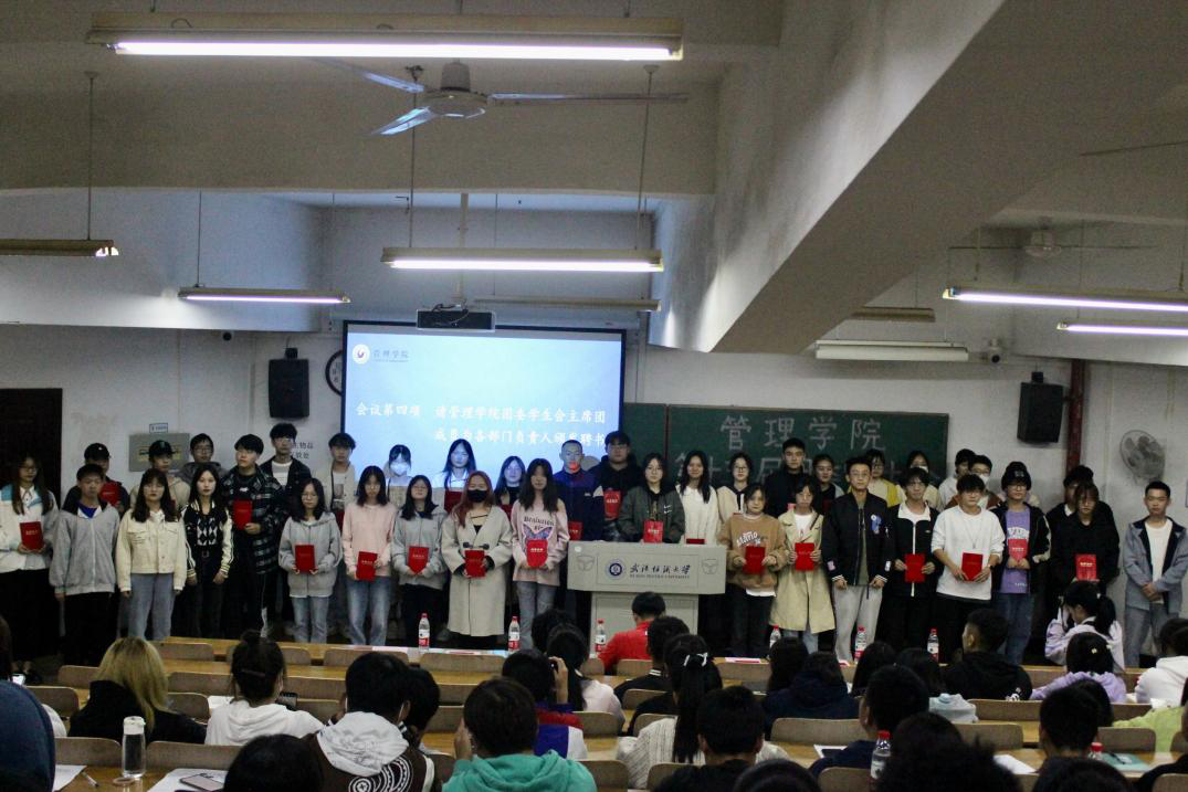 伟德国际1946源于英国团委书记王双喜与主席团成员分别为主席团和各部门负责人颁发学生干部聘书,同时各部门负责人依次上台介绍各部门情况,并对部门新成员提出未来工作展望。
