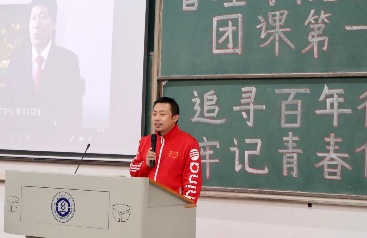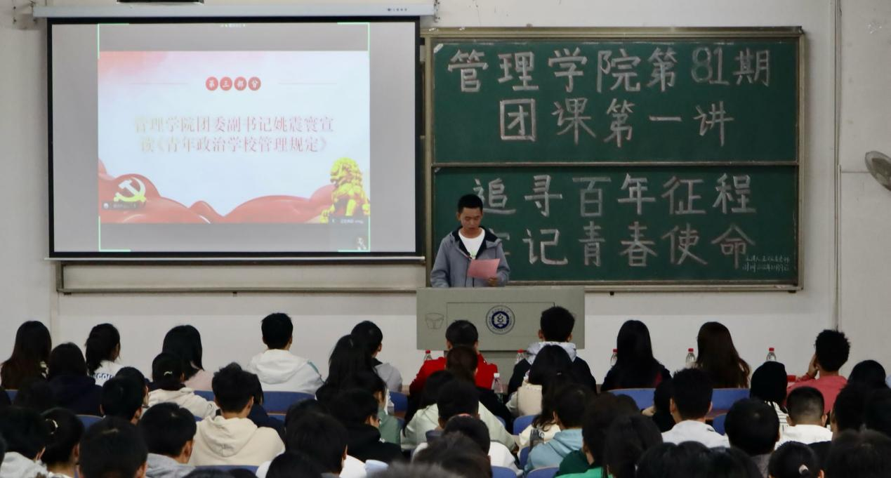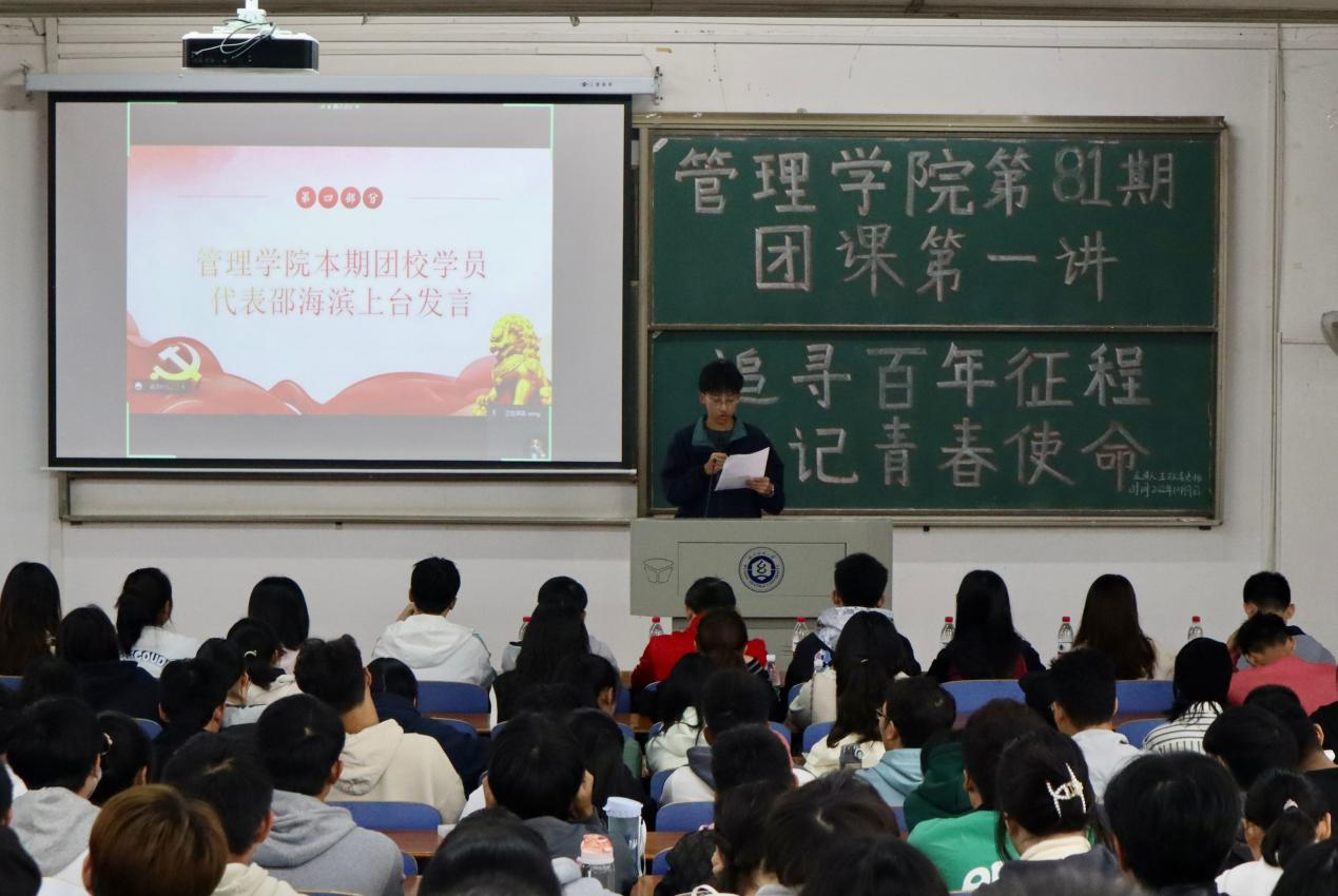 团委书记王双喜为同学们带来了团课第一讲《追寻百年征程 牢记青春使命》。王双喜首先通过建团百年主题宣传片《共青春》和同学们一起回顾了一百年来共青团始终坚定不移跟党走,在中国共产党的领导下前赴后继、勇当先锋,用青春和热血书写了彪炳史册的壮丽篇章。