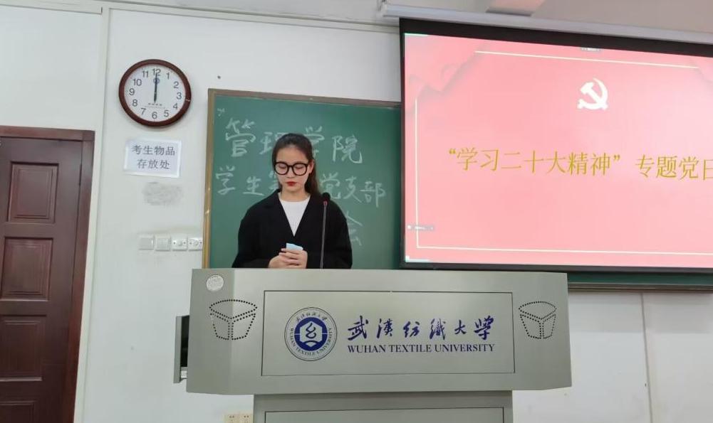 紧接着,大家共同观看了党的二十大的重要讲话片段。随后现场党员同志踊跃发言并积极交流了学习心得。张雪薇同志表示:“能够有这样的机会和广大青年学子一同表达对党的二十大胜利召开的心情,讲述新时代青年的理想与奋斗,是一件令人自豪的事情。我们必须锐意进取、艰苦奋斗,不负党对青年的期盼。”王丽娜同志表示:“党的二十大报告提到‘要坚持教育优先发展、科技自立自强、人才引领驱动,加快建设教育强国、科技强国、人才强国,坚持为党育人、为国育才,全面提高人才自主培养质量,着力造就拔尖创新人才,聚天下英才而用之。’作为新时代的一名青年学子,我们理应做走在时代前面的奋进者、开拓者、奉献者,努力使自己成为祖国建设的有用之才、栋梁之材,为实现中国梦奉献智慧和力量。”