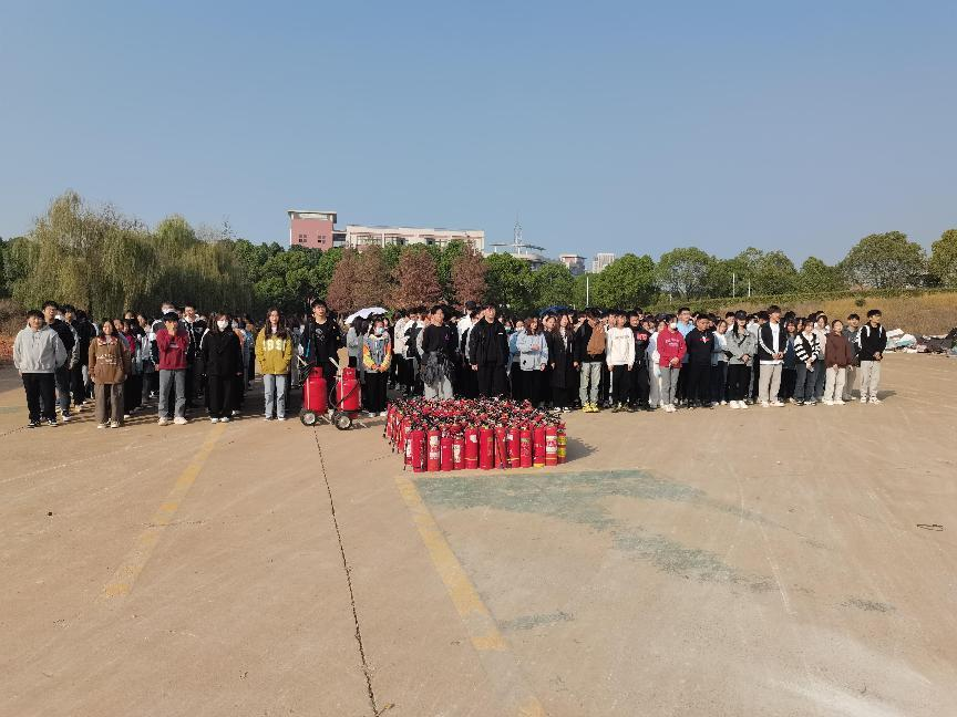 演练场上,保卫处工作人员提前准备好300多罐干粉灭火器和燃烧火盆,按照学生10人一组,为学生详细讲解了防火安全常识、火灾的严重危害以及如何扑救初起火灾等消防知识。
