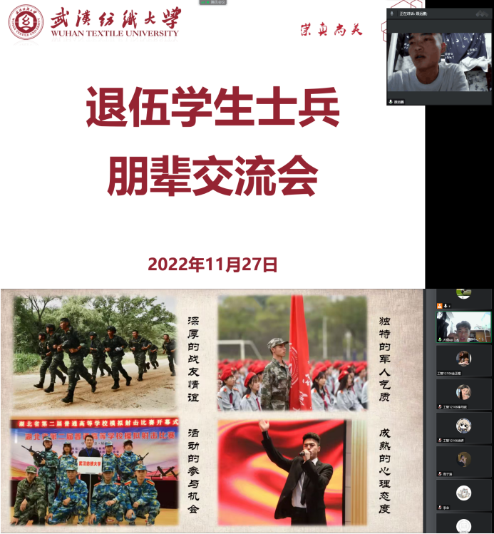 首先,周成杰同学从自身出发,分享了自己的入伍初心,并希望大家能够明确自己参军入伍的动机,树立正确的入伍初心。周成杰结合自己的经历,分享了自己在部队的所见所闻,通过照片的形式描述了部队的日常生活和训练剪影,然后又向大家讲述自己退伍后的所得所感,部队经历带来的意志品格、军人气质等方面的感悟;紧接着,聂远鹏同学也分享了自己的从军报国之志以及在部队的点点滴滴,并谈到部队有严格执行规章制度,再部队能够提高个人素质,磨练自己。聂远鹏说,我现在已经大四了,即将毕业,但是我现在还想二次参军入伍,继续磨练自己。最后,两位优秀退伍学生通过自由提问的方式,解答了同学们关于大学生入伍的常见问题,并呼吁同学们敢于参军历练,承担起自己作为一名中华好男儿的应有担当。