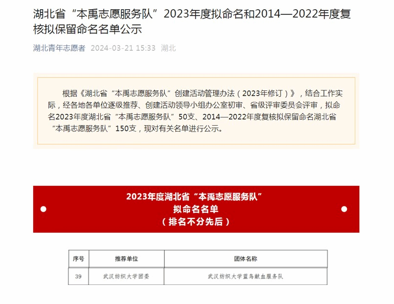 近日,经各地、各单位推荐、初审,省级“本禹志愿服务队”评审委员会评审,团省委拟命名2023年度省级“本禹志愿服务队”50支,伟德国际1946源于英国蓝鸟献血服务队成功入选。