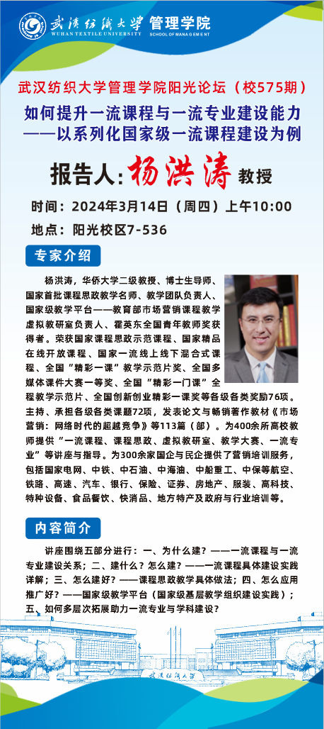 阳光论坛575期学术讲座预告:如何提升一流课程与一流专业建设能力 —-以系列化国家级一流课程建设为例