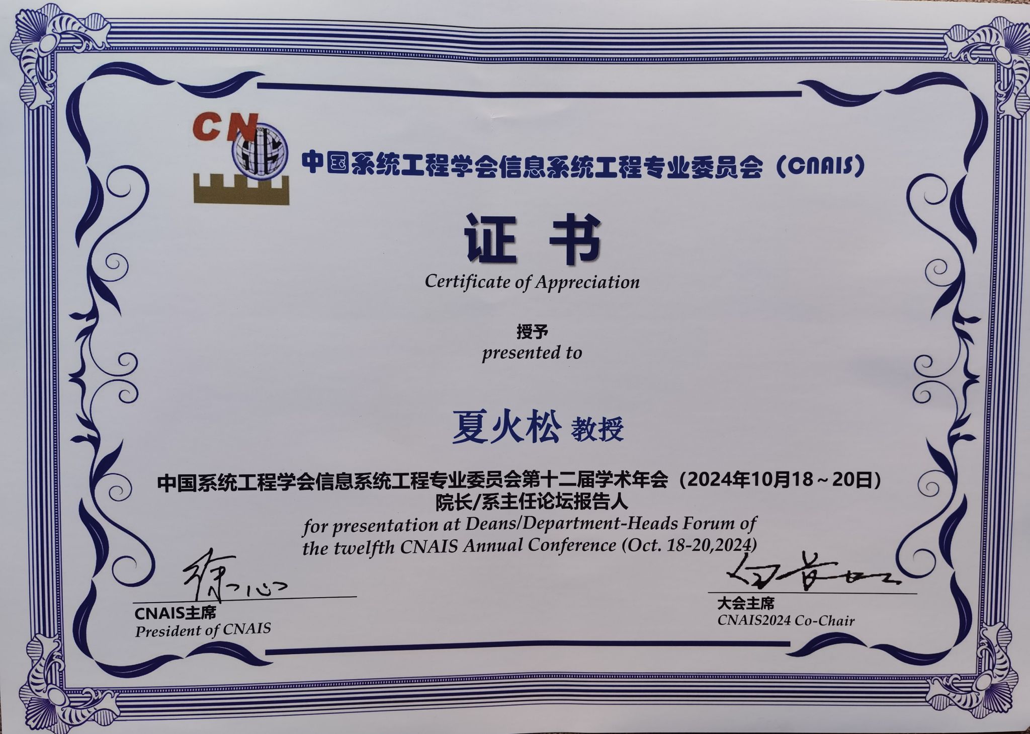 2024年10月18日至20日,中国系统工程学会信息系统工程专业委员会(CNAIS)第十二届全国大会暨2024学术年会在天津成功举办。伟德官网夏火松教授作为受邀嘉宾,出席了此次盛会,并在主题为“信息管理与信息系统专业建设与人才培养”的院长/系主任论坛上做了题为《AI情景下的地方高校信管专业人才培养模式》的报告。