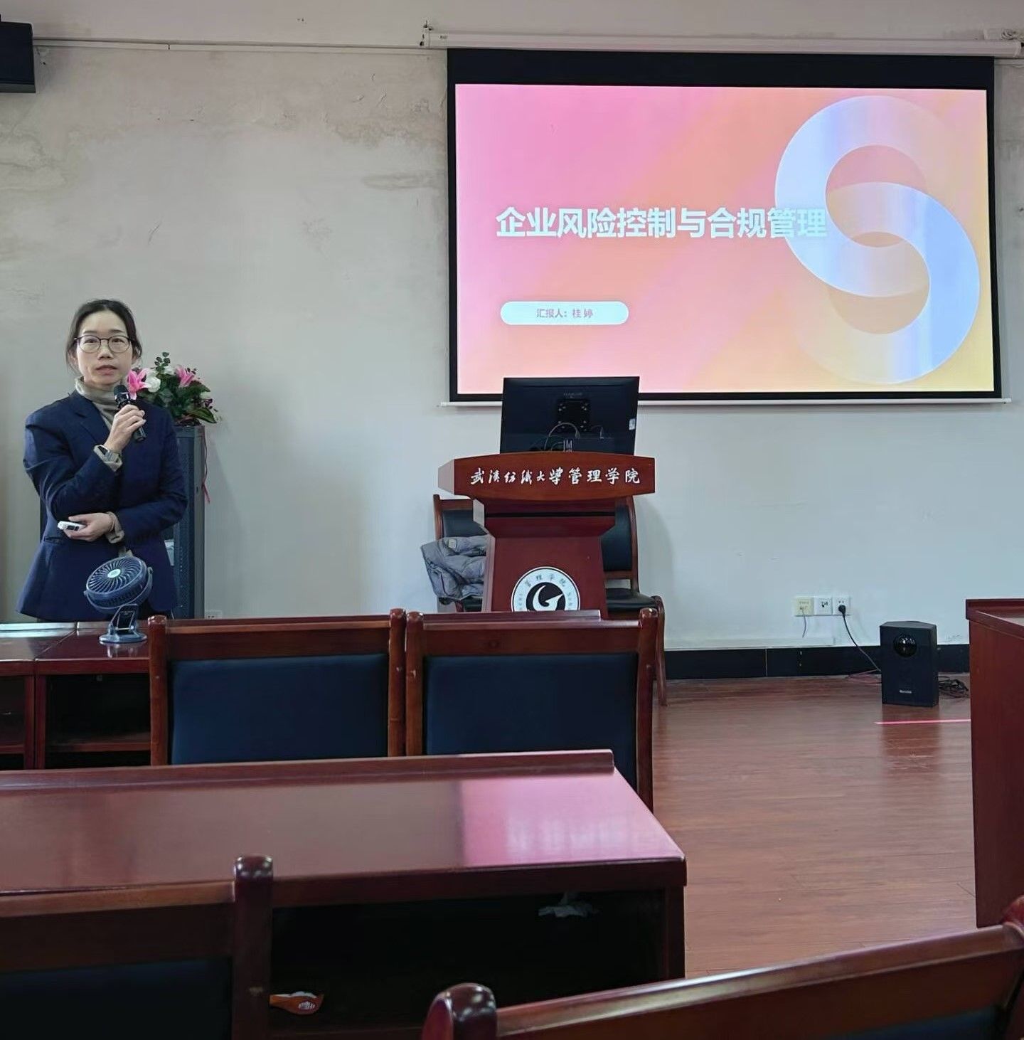 12月24日下午,伟德国际1946源于英国在崇德楼513室举办了实务专家大讲堂2024年第4期。本次讲座的主题为“企业风险控制与合规管理”,特别邀请到湖北宏泰集团有限公司风险管理部副总经理桂婷做专题报告。学院2024级研究生参加讲座。讲座由伟德国际1946源于英国副教授任俊霖主持。