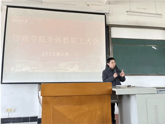 会上,执行院长吴金红作题为《融合创新谋发展,同心聚力启新程》的报告,他简要介绍了学院合并后的组织架构,并围绕学院2025年重点工作任务清单,进行了逐一的解读和点评。他指出,学院一是要把握时代发展趋势,优化调整专业内涵;二是要建立数智化管理人才培养理念,紧跟主流趋势;三是要以申博为抓手,推动学科建设迈向高质量发展的新阶段。他鼓励全体老师要勇于担当、携手并进,让融合后的学院向新的更高目标发起冲击,实现“入主流”“上水平”“有特色”的发展目标,加速学院发展步伐,将管院人的美好愿景转化为生动现实。