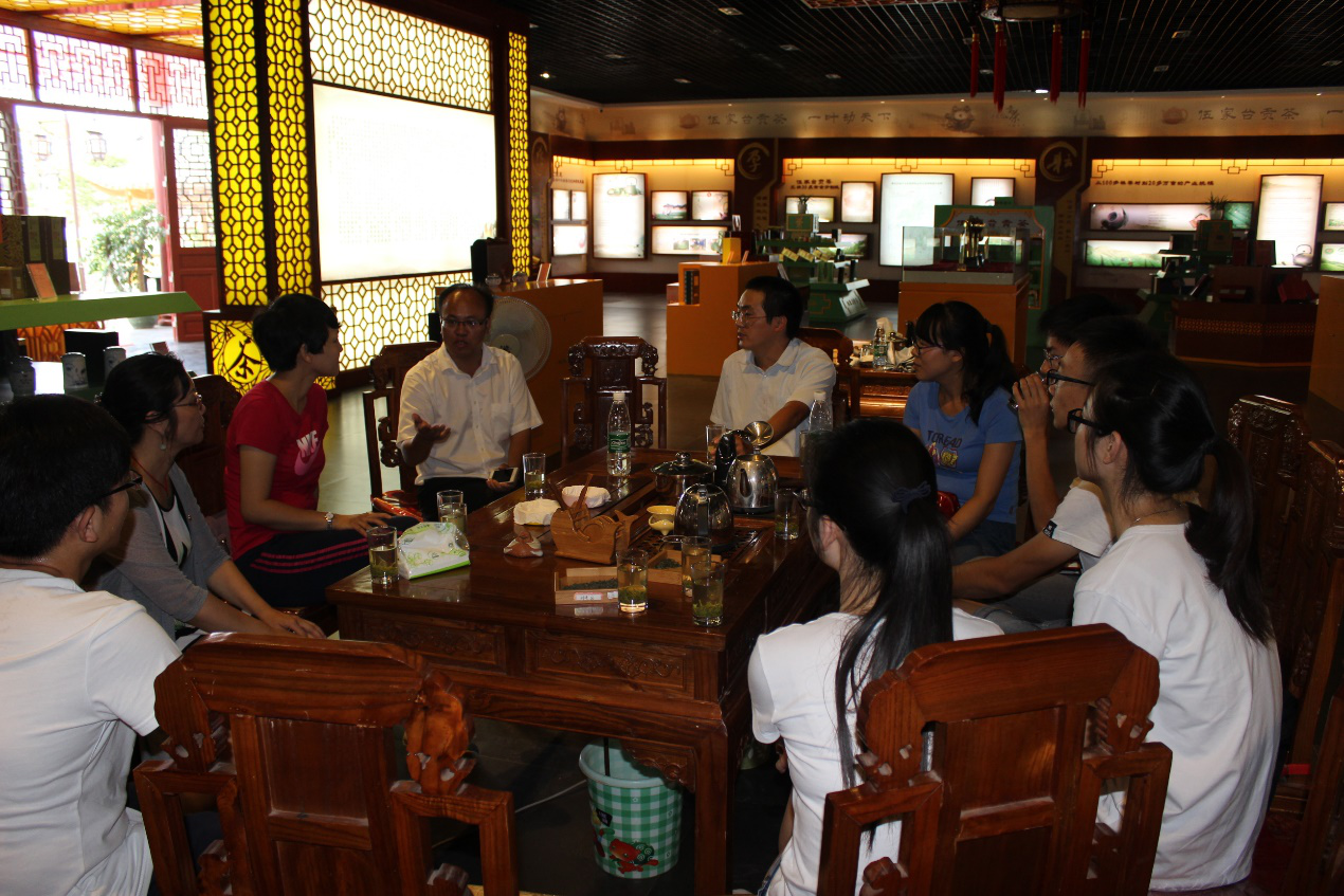 侯德林副教授指出,高校作为培养人才的服务型组织,可以与企业对接和合作,针对性的为企业培养出实用性的电商人才。希望企业依靠成熟的电商网络平台,将企业茶叶采摘、茶叶加工以及包装等流程做成直观视频进行线上宣传,提高伍家台贡茶的知名度和可信度,提升茶叶在消费者心中的形象,提高茶叶的品牌效应。利用茶叶+文化+旅游等方式,延长茶产品的产业链,提高附加值,实现企业效益的可持续增长。企业探访结束后,实践队员与企业负责人合影留念。