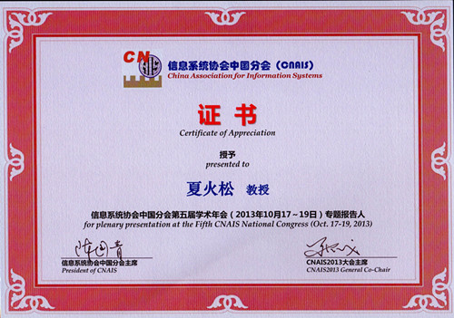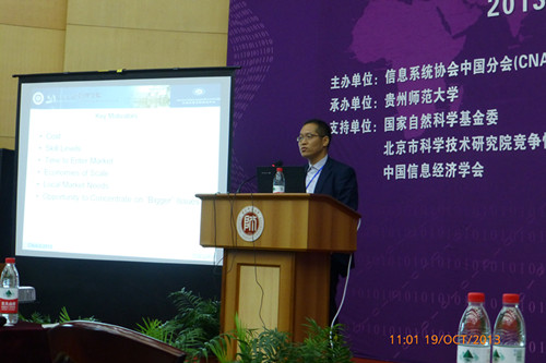 近日,国际信息系统协会中国分会第五届学术年会(CNAIS2013)在贵州师范大学召开,大会邀请了国际知名的Paulo Goes教授(MIS Q 主编,University of Arizona),国际期刊ECRA联合主编、美国伊利诺伊大学芝加哥分校的Christopher Westland教授作了特邀报告,共有国际、国内专家学者约400人参加了会议。本次大会的主题为“大数据背景下的信息系统研究与实践”。 我校伟德国际1946源于英国夏火松院长、教授应邀出席了会议。