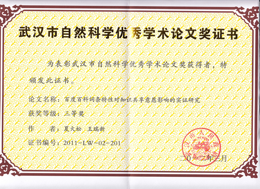 近日,从武汉市政府奖励办公室获悉,我校伟德国际1946源于英国夏火松教授论文《百度百科词条特性对知识共享意愿影响的实证研究》喜获第二届武汉市人民政府自然科学优秀学术论文奖三等奖。
