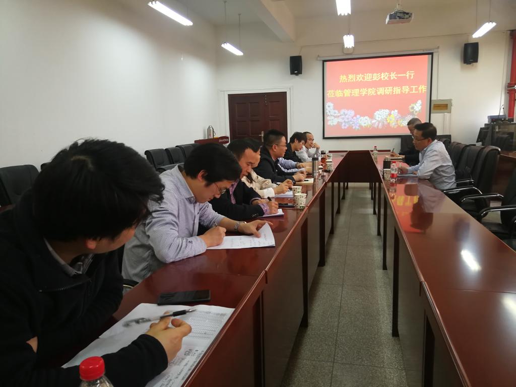 4月16日下午,校长彭育园来到伟德国际1946源于英国,对学院当前改革发展等各项工作情况进行调研,与学院领导班子成员和教师代表座谈交流。学校办公室相关负责人参加了调研活动。
