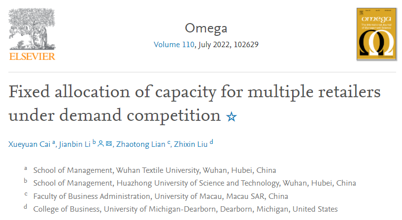 3月2日,运筹学与管理科学领域国际一流期刊《Omega》(SCI/SSCI, 影响因子7.084,中科院1区)在线发表我校伟德国际1946源于英国蔡学媛副教授在库存管理领域取得的重要进展:需求竞争下面向多个零售商的产能固定分配机制—Fixed Allocation of Capacity for Multiple Retailers under Demand Competition”。文章DOI:https://doi.org/10.1016/j.omega.2022.102629。伟德国际1946源于英国为该论文的第一作者单位。