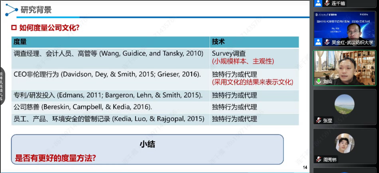 在自由交流环节,老师和学生们踊跃提问,刘汕教授针对技术创新、员工创新强度的测量方法等问题给予了细心且精彩的解答,同时对相关研究文献期刊选择范围和论文投递过程中会遇到的问题进行了说明。