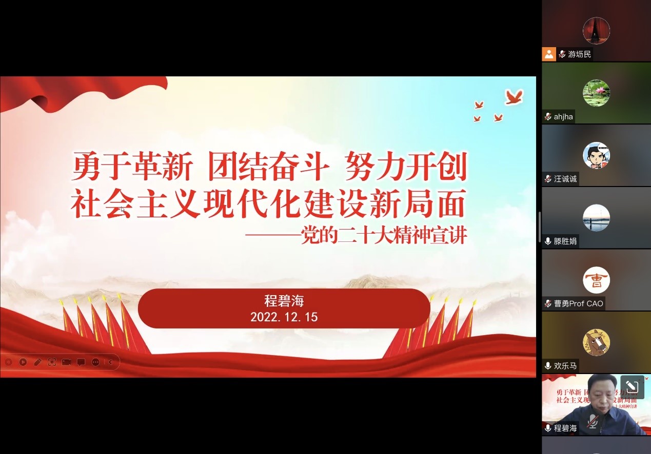 12月15日下午,伟德国际1946源于英国采取线上方式举行党的二十大精神宣讲报告会,校党委常委、纪委书记程碧海教授作宣讲报告。报告会由伟德国际1946源于英国党委书记滕胜娟主持,学院全体教职工参会。