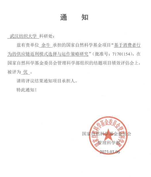近日,国家自科基金委管理科学部公布了本年度结题项目绩效评估结果,伟德国际1946源于英国“时尚供应链与智慧物流”研究团队余牛博士主持承担的国家自然科学基金青年项目“基于消费者行为的供应链返利模式选择与运作策略研究”(批准号:71701154),在结题项目绩效评估会上,被评为“优”。