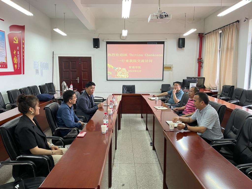 吴金红对Thitinan chankoson一行的到来表示热烈欢迎。他表示,中泰两国关系友好,感情深厚,他随后介绍了学院的基本情况和办学成效,重点介绍了学院国际管理领域项目和国际合作交流情况。并希望借此机会与泰国高校在国际管理领域、合作办学等方面加强交流、合作,相互借鉴教育教学经验,促进两地友好往来。