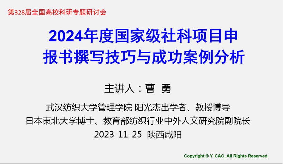 近年来,曹勇教授结合自己主持多项国家自科基金、教育部社科基金和国家社科基金的经历,发挥专业特长,受邀为全国10多省市30多所高校和政府机构做专题辅导讲座,以实际行动“走出去”为美好纺大建设做出贡献,不仅展现了伟德官网学者的学术能力与责任担当,也为进一步提升我校的社会地位与学术影响、促进我校服务社会尽了微薄之力。