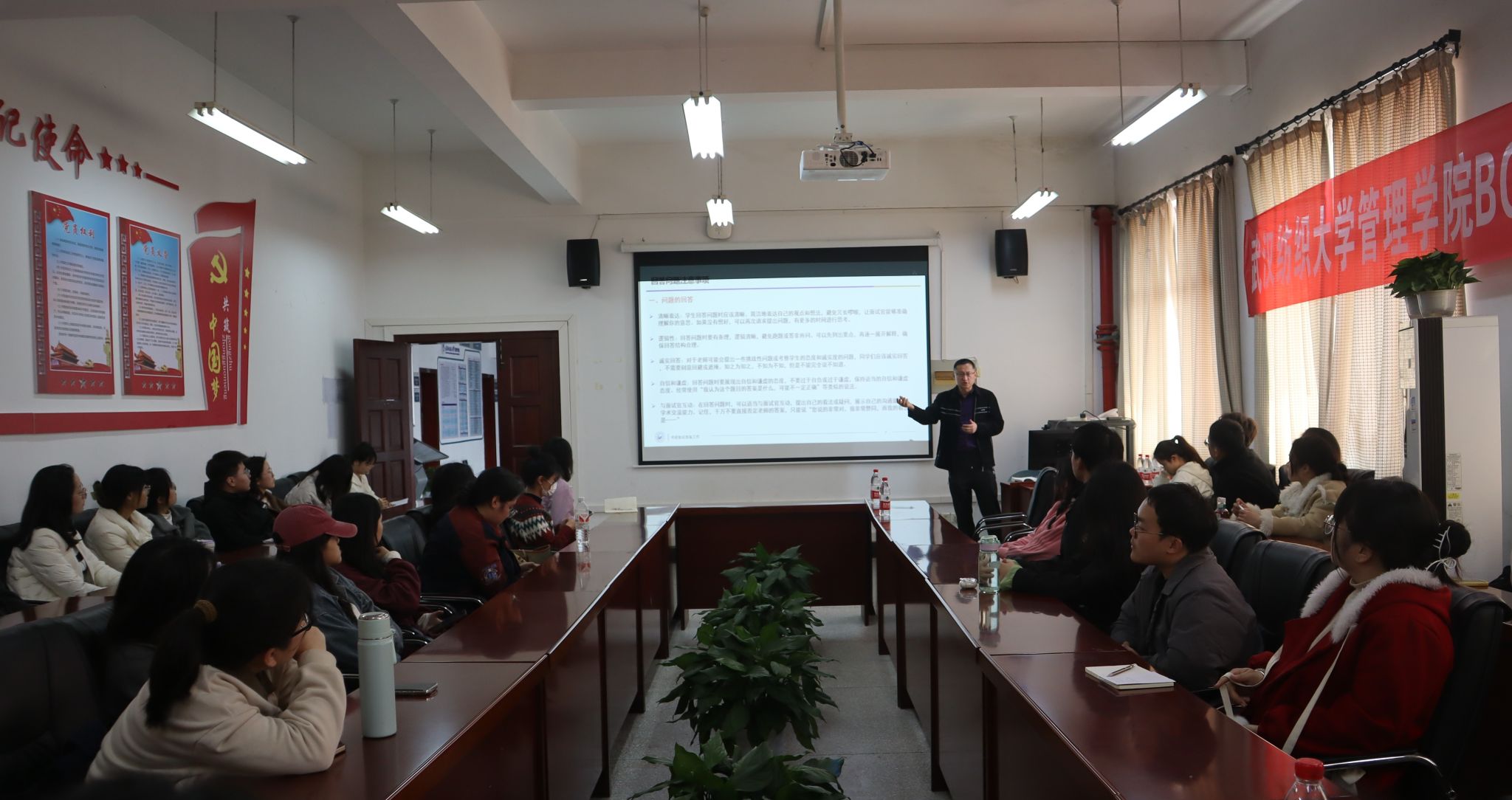 张筝从复试准备工作、自我介绍、回答问题、调剂学校四个方面向同学们进行了详细讲解。他强调,一定要熟悉复试流程,提前准备相关材料,流畅表述自我介绍;复试中回答问题要清晰、诚实、自信、有逻辑性,尽可能展现自己良好的学术水平和强烈的学习动机;如果有机会调剂,一定抓住这个机会,及时搜寻相关学校信息,保持与目标院校的沟通。