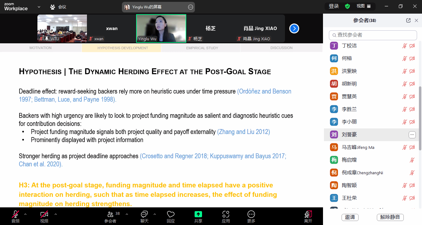 北京时间4月16日上午9:00,应伟德国际1946源于英国邀请,美国约翰卡罗尔大学Boler商学院Yinglu Wu(伍莹璐)副教授为伟德官网师生带来题为“Herd Behavior in Reward-Based Crowdfunding at the Post-Goal Stage”的线上学术讲座。本次讲座由副院长吴锦峰教授主持,伟德国际1946源于英国教师及研究生积极线上与线下参会。