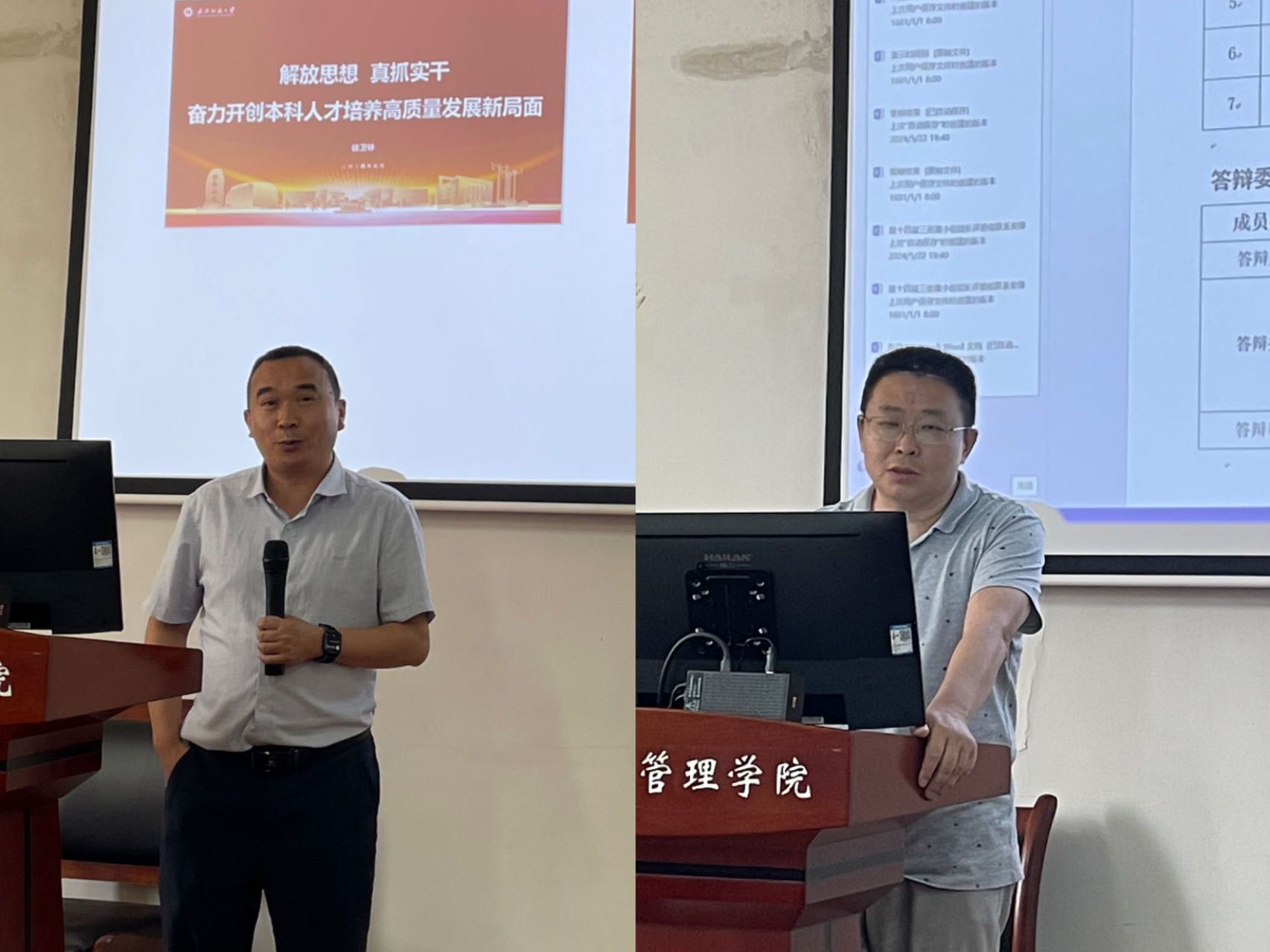 院长吴金红就学院近期毕业答辩、各专业发展、学院制度文件修订、期中教学工作情况、三创赛承办、硕士生毕业答辩等主要工作进行回顾与安排,重点解读了学校新时代本科教育高质量创新发展大会精神,并就学校专业评价指标做了重点分析与介绍,就学院如何深化改革、解放思想、创新发展、真抓实干等方面提出了自己的建议与思考。