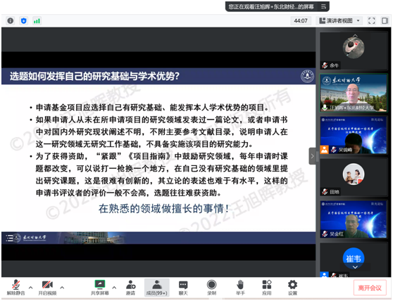 在讲座过程中,汪教授结合当前基金申报中的“变”与“不变”的因素,从“导向、规则、视角、研究内容与设计”四个方面,分析了当前基金申报的新变化,并从日常研究与基金项目的关系、工匠精神等方面勉励大家坚持不懈的开展学术研究。然后,分别以国家自科基金和国家社科基金为例,从选题、文献综述、目标、研究内容、研究方案、创新点、摘要等方面向与会的教师传授宝贵的申报经验,并针对基金申请书撰写中的常见问题“问诊把脉”,提出了相应的建议。汪教授特别强调,好的选题标准包括:问题导向、有矛盾冲突的故事、核心变量的关系不明晰、探索一般性规律、实践引领等。