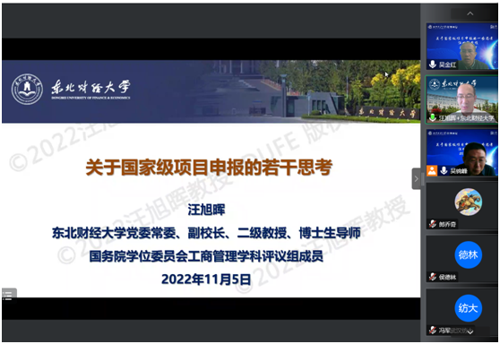 11月5日下午,应伟德国际1946源于英国邀请,国务院学位委员会工商管理学科评议组成员、东北财经大学副校长汪旭晖教授为伟德官网师生带来了一场精彩的线上学术讲座,讲座题目为“关于国家级项目申报的若干思考”。本次讲座由伟德国际1946源于英国吴金红院长、吴锦峰副院长共同主持,我校党委常委、副校长冯军出席并致辞,伟德国际1946源于英国滕胜娟书记及相关领域教师、研究生积极参与讨论。