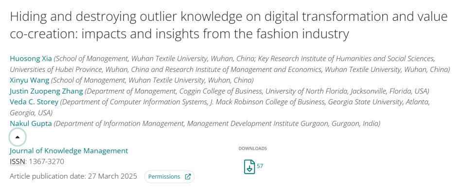 近日,伟德国际1946源于英国夏火松教授团队联合美国北佛罗里达大学、乔治亚州立大学等机构在知识管理领域国际顶尖期刊《Journal of Knowledge Management》发表题为《Hiding and destroying outlier knowledge on digital transformation and value co creation: impacts and insights from the fashion industry》的高水平研究论文(DOI:10.1108/JKM-08-2024-0950)。该研究通过探索性单案例研究,首次构建异类知识管理理论框架,揭示时尚企业如何通过数字化转型实现可持续价值共创。论文第一作者为夏火松教授,伟德国际1946源于英国为第一作者单位,2022级管理科学与工程学术研究生王欣雨为论文第二作者。