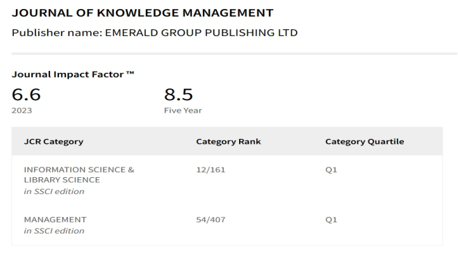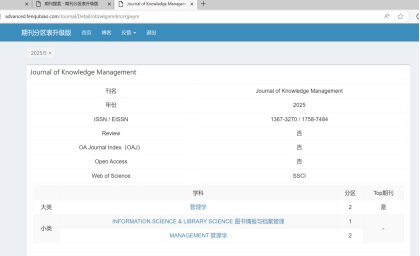 《Journal of Knowledge Management》是专注于知识管理理论与实践研究的国际权威学术期刊,是知识管理排名第一,SSCI JCR Q1;中科院2025年分区1。