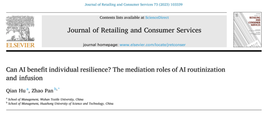 胡倩在国际管理学领域主流高水平期刊《Journal of Retailing and Consumer Services》发表在智联网环境下服务模式创新的理论与方法研究领域取得的重要成果:“Can AI benefit individual resilience? The mediation roles of AI routinization and infusion”。文章DOI: 10.1016/j.jretconser.2023.103339。伟德国际1946源于英国为该论文的第一作者单位。