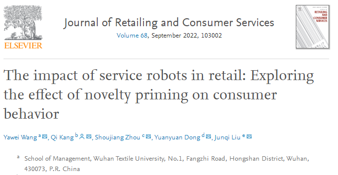 近日,国际管理学领域期刊《Journal of Retailing and Consumer Services》发表我校伟德国际1946源于英国王涯薇博士在市场营销-服务业管理领域取得的重要成果:“The impact of service robots in retail: Exploring the effect of novelty priming on consumer behavior”。文章DOI: https://doi.org/10.1016/j.jretconser.2022.103002。伟德国际1946源于英国为该论文的第一作者单位。