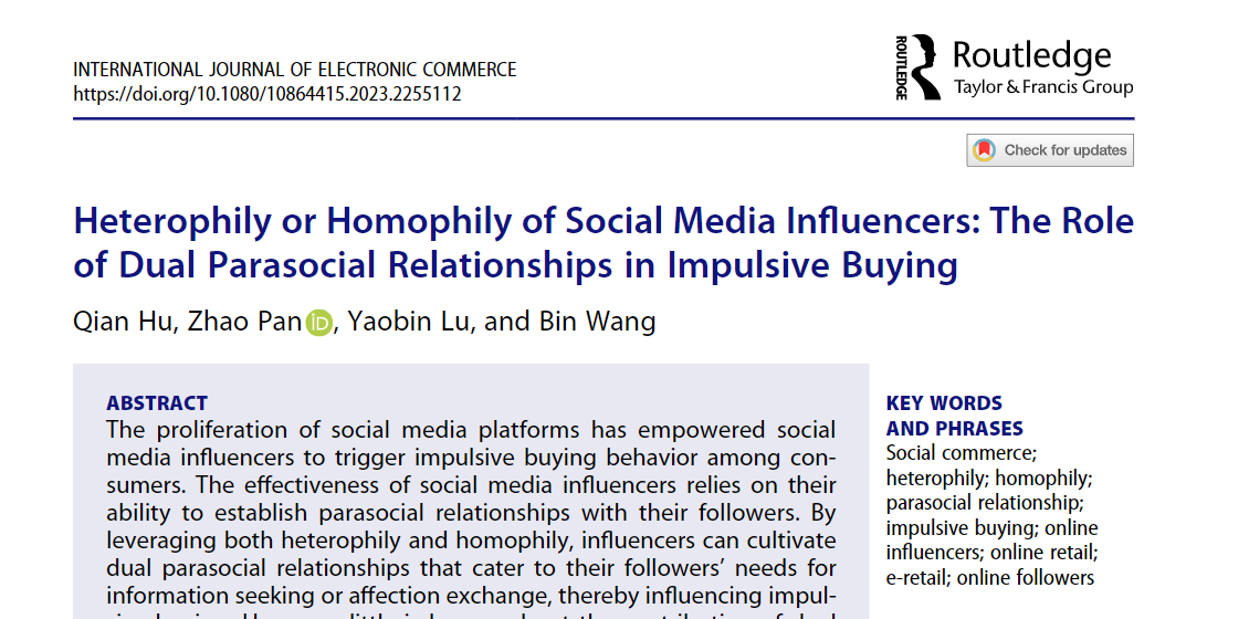 近期,国际管理学领域期刊《International Journal of Electronic Commerce》发表我校伟德国际1946源于英国胡倩博士在社会化商务消费者行为研究领域取得的重要成果:“Heterophily or Homophily of Social Media Influencers: The Role of Dual Parasocial Relationships in Impulsive Buying”。文章DOI: 10.1080/10864415.2023.2255112。伟德国际1946源于英国为该论文的第一作者单位。