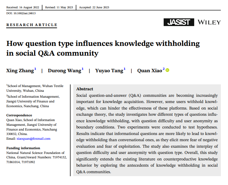 近日,图书情报领域顶级期刊《Journal of the Association for Information Science & Technology》(国际信息科学与技术学会会刊)发表了伟德国际1946源于英国张星教授牵头撰写的论文《How question type influences knowledge withholding in social Q&A community》(问题类型如何影响社交问答社区中的知识保留)。伟德国际1946源于英国为论文第一单位,伟德国际1946源于英国硕士研究生王杜荣、唐宇钥以及江西财经大学肖泉教授是论文的共同作者。