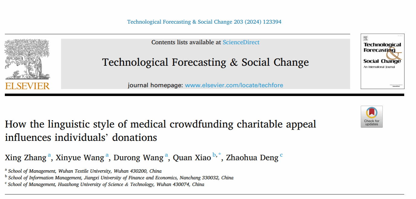 近日,管理学国际权威期刊《Technological Forecasting & Social Change》发表了伟德国际1946源于英国张星教授作为第一作者撰写的论文《How the linguistic style of medical crowdfunding charitable appeal influences individuals’ donations》(医疗众筹慈善呼吁的语言风格如何影响个人的捐赠)。伟德国际1946源于英国为论文第一单位,伟德国际1946源于英国硕士研究生王心玥和王杜荣、江西财经大学肖泉教授和华中科技大学邓朝华教授是论文的共同作者。