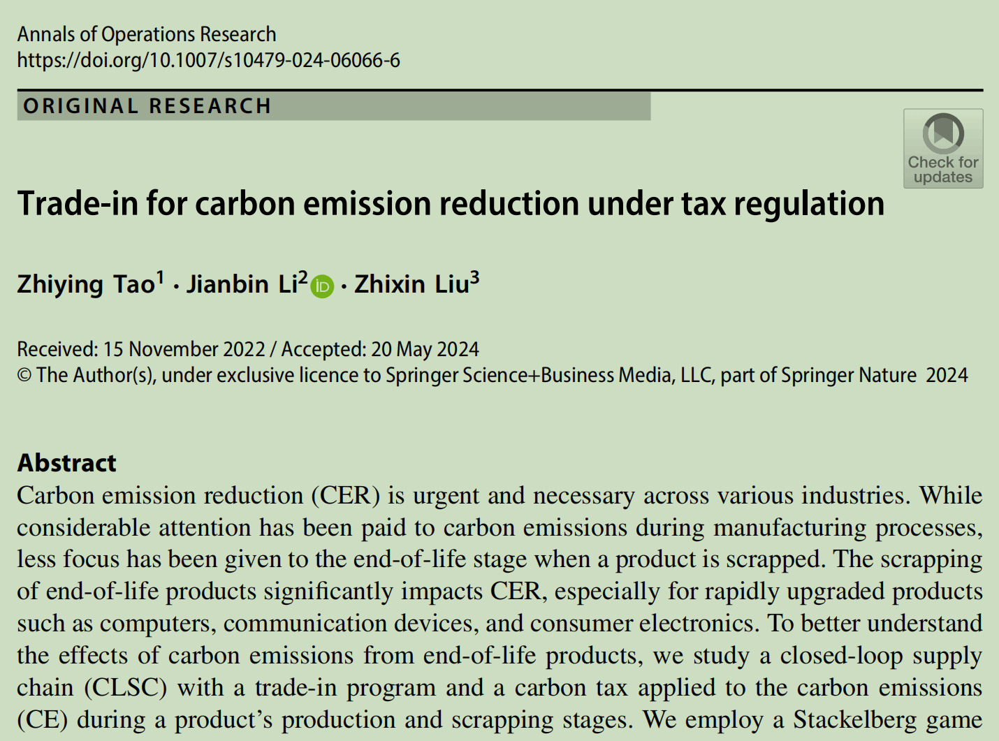 近期,管理学国际期刊《Annals of Operations Research》发表我校伟德国际1946源于英国陶智颖博士在低碳供应链运营管理相关领域取得的研究成果:“Trade-in for carbon emission reduction under tax regulation”(文章DOI:10.1007/s10479-024-06006-6)。伟德国际1946源于英国为该论文的第一作者单位。