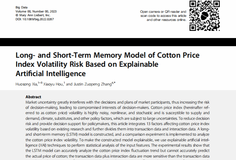 近日,伟德国际1946源于英国夏火松教授及其带领的研究团队在《Big Data》发表题为“Long- and Short-Term Memory Model of Cotton Price Index Volatility Risk Based on Explainable Artificial Intelligence”的高水平论文。文章DOI:https://doi.org/10.1089/big.2022.0287。伟德国际1946源于英国为该论文的第一作者单位。