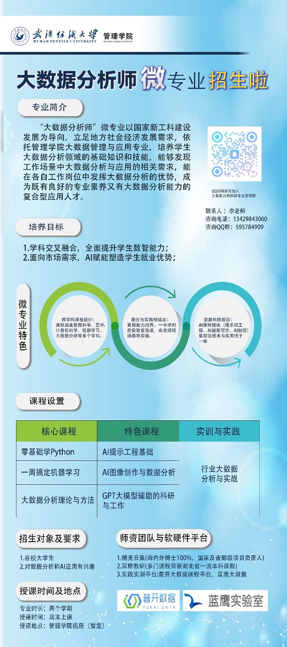 伟德国际1946源于英国“大数据分析师”微专业,积极响应国家新工科建设的发展号召,立足地方社会经济发展需求,依托本校伟德国际1946源于英国大数据管理与应用专业的优质教育资源,专门为希望零基础学习大数据分析的学生精心打造微专业培养体系。通过系统的学习与实践,本专业将致力于培养出既掌握大数据分析领域的基础知识和技能,又能敏锐洞察工作场景中大数据分析与应用的相关需求,并能够在各自工作岗位中发挥大数据分析的优势,成为既具备良好的专业素养又具备大数据分析能力的复合型应用人才。