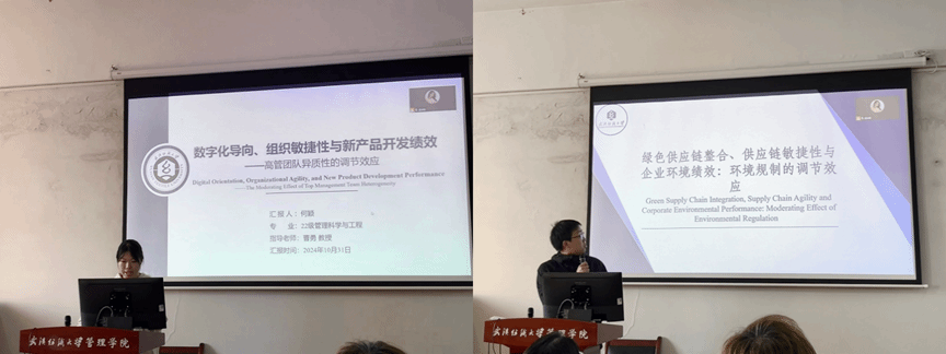 首先分享的是来自22级的何颖同学,介绍了论文《数字化导向、组织敏捷性与新产品开发绩效——高管团队异质性的调节效应》,本研究构建了数字化导向对NPD绩效的影响机理模型,并进一步探讨组织敏捷性的中介作用以及高管团队异质性的调节效应。接下来,来自22级的陈裕超同学分享了《绿色供应链整合、供应链敏捷性与企业环境绩效:环境规制的调节效应》的相关内容,基于资源基础观和动态能力理论,通过对378家制造企业的大样本调查,实证分析了绿色供应链整合对企业环境绩效的影响机制及其边界条件。