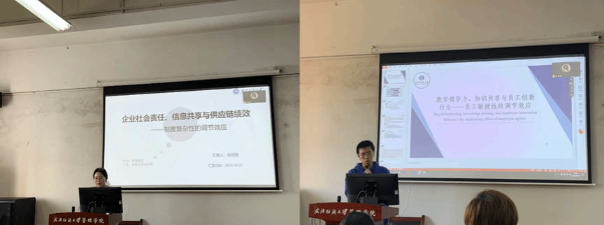 第五位分享者是22级的郑昭雅同学,介绍了论文《企业社会责任、信息共享与供应链绩效——制度复杂性的调节效应》,本研究基于利益相关者和制度复杂性理论,实证分析306家制造企业的样本数据,探讨企业社会责任、信息共享及制度复杂性对供应链绩效的影响。最后,来自22级的陈炳轩同学介绍了论文《数字领导力、知识共享与员工创新行为:员工敏捷性的调节效应》,本研究基于高层梯队理论与知识基础观构建有调节的中介效应模型,并针对制造企业的问卷调查数据,实证研究数字领导力对员工创新行为的影响机理及其边界条件。