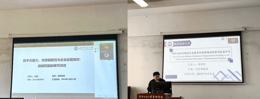 第三位进行分享的是来自22级的肖丽同学,对“数字化能力、供应链韧性与企业运营绩效:战略匹配的调节效应”相关研究进行了讲解,其研究基于动态能力理论,运用我国制造企业的大样本问卷调查数据,实证分析了数字化能力对企业运营绩效的影响机制及其边界条件。随后,来自22级的周秀桥同学介绍了“组织柔性对制造企业数字化转型绩效的影响机制”的研究,该研究基于资源基础和动态能力理论,实证分析了组织柔性对制造企业数字化转型绩效的影响,探讨了数字化转型能力的中介作用和竞争强度的调节作用。