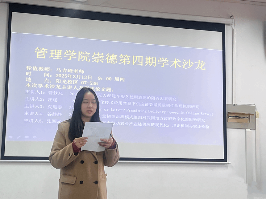 2025年3月13日,阳光校区7-536教室学术氛围热烈,2025年第4期崇德学术沙龙在此进行。本期沙龙特邀伟德国际1946源于英国马吉峰老师担任指导嘉宾,5位同学围绕无人配送技术、数智化供应链、电商物流时效、数据安全治理及农业现代化等前沿议题展开研究成果分享,师生互动深入,学术观点碰撞交融。
