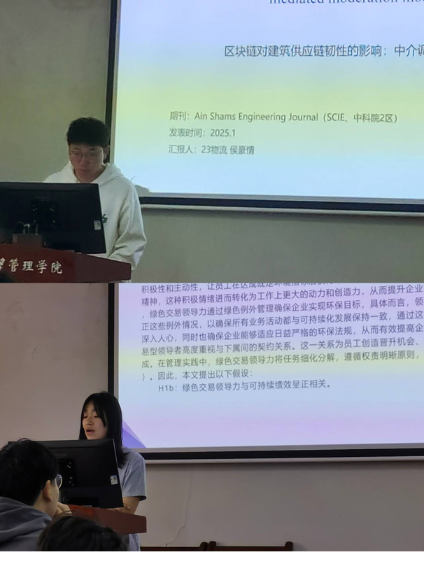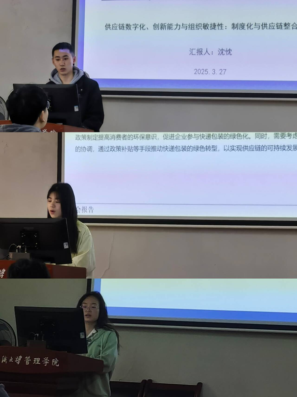 沈忱同学探讨《供应链数字化、创新能力与组织敏捷性:制度化与整合的调节作用》,基于动态能力理论提出供应链数字化通过创新思维驱动敏捷性的路径。通过对201家企业数据的实证分析,发现数字化显著提升创新能力并间接增强敏捷性,而供应链整合正向调节这一过程,制度化则产生抑制作用。周璇同学聚焦《政府补贴对快递包装供应链的环境、经济和社会影响》,运用系统动力学模型模拟制造商、消费者与回收商三子系统互动。袁缘同学在《环境信息披露下供应链网络的绿色创新产出实证分析》中,基于1048家A股上市公司数据,揭示供应链网络力与凝聚力对绿色创新的双刃效应:二者单独作用正向促进创新,但过度交互易引发信息超载。
