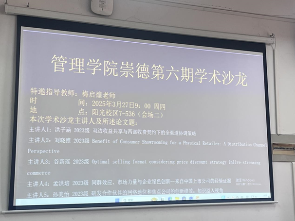 分会场7-536教室,首先洪子涵同学以《双边收益共享与两部收费契约下的全渠道协调策略》为题,通过构建博弈模型分析了线上线下渠道的利益分配矛盾,提出“动态契约+数据共享”的双轨协调机制,为全渠道供应链效率提升提供新思路。随后,刘晓雅同学汇报了论文《Benefit of Consumer Showrooming for a Physical Retailer: A Distribution Channel Perspective》,通过实证研究发现,消费者“展厅行为”虽导致短期销售分流,但能显著提升实体店的品牌认知与长期客户黏性。谷新瑶同学带来了《Optimal selling format considering price discount strategy in live-streaming commerce》的论文分享,结合动态定价模型与消费者心理阈值,揭示了“限时折扣+互动引流”组合策略对成交效率的显著影响。